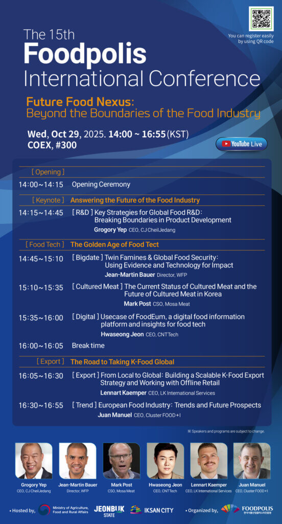 La presencia de FOOD+i en este evento de referencia, organizado por Foodpolis y apoyado por el Ministerio de Agricultura coreano, demuestra el posicionamiento de la Global Alliance for Food en la agenda de innovación mundial.
